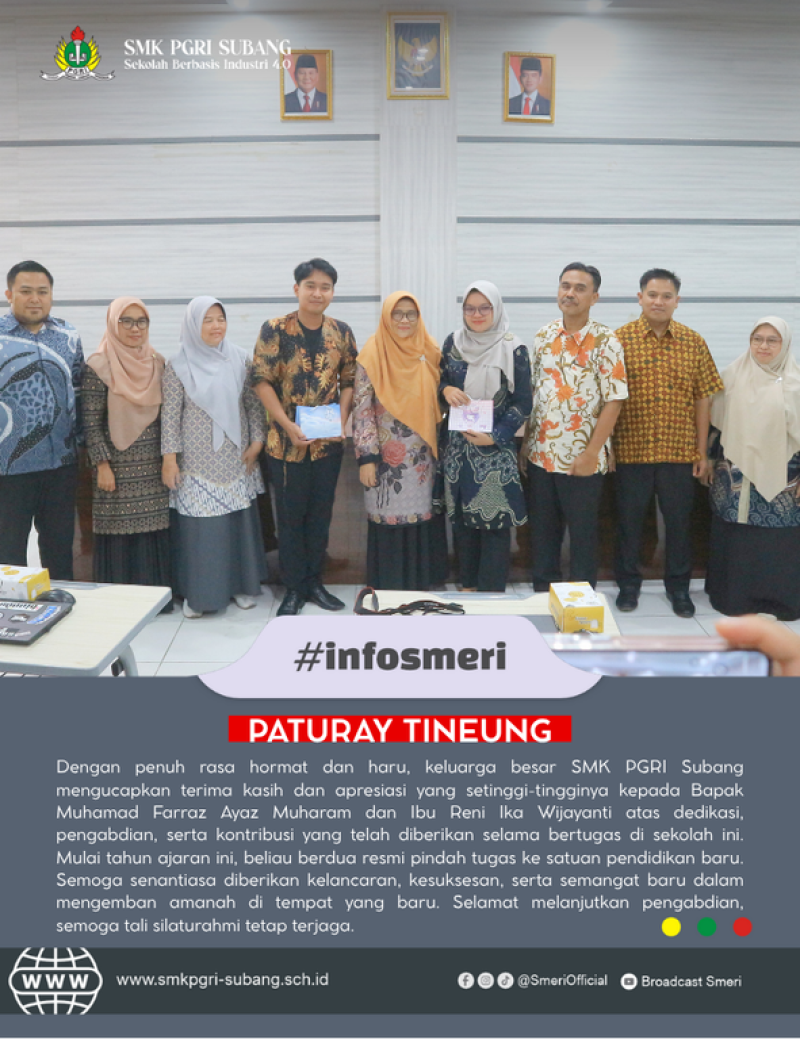 Dengan penuh rasa hormat dan haru, keluarga besar SMK PGRI Subang mengucapkan terima kasih dan apresiasi yang setinggi-tingginya kepada Bapak Muhamad Farraz Ayaz Muharam dan Ibu Reni Ika Wijayanti atas dedikasi, pengabdian, serta kontribusi yang telah diberikan selama bertugas di sekolah ini. Mulai tahun ajaran ini, beliau berdua resmi pindah tugas ke satuan pendidikan baru. Semoga senantiasa diberikan kelancaran, kesuksesan, serta semangat baru dalam mengemban amanah di tempat yang baru. Selamat melanjutkan pengabdian, semoga tali silaturahmi tetap terjaga.